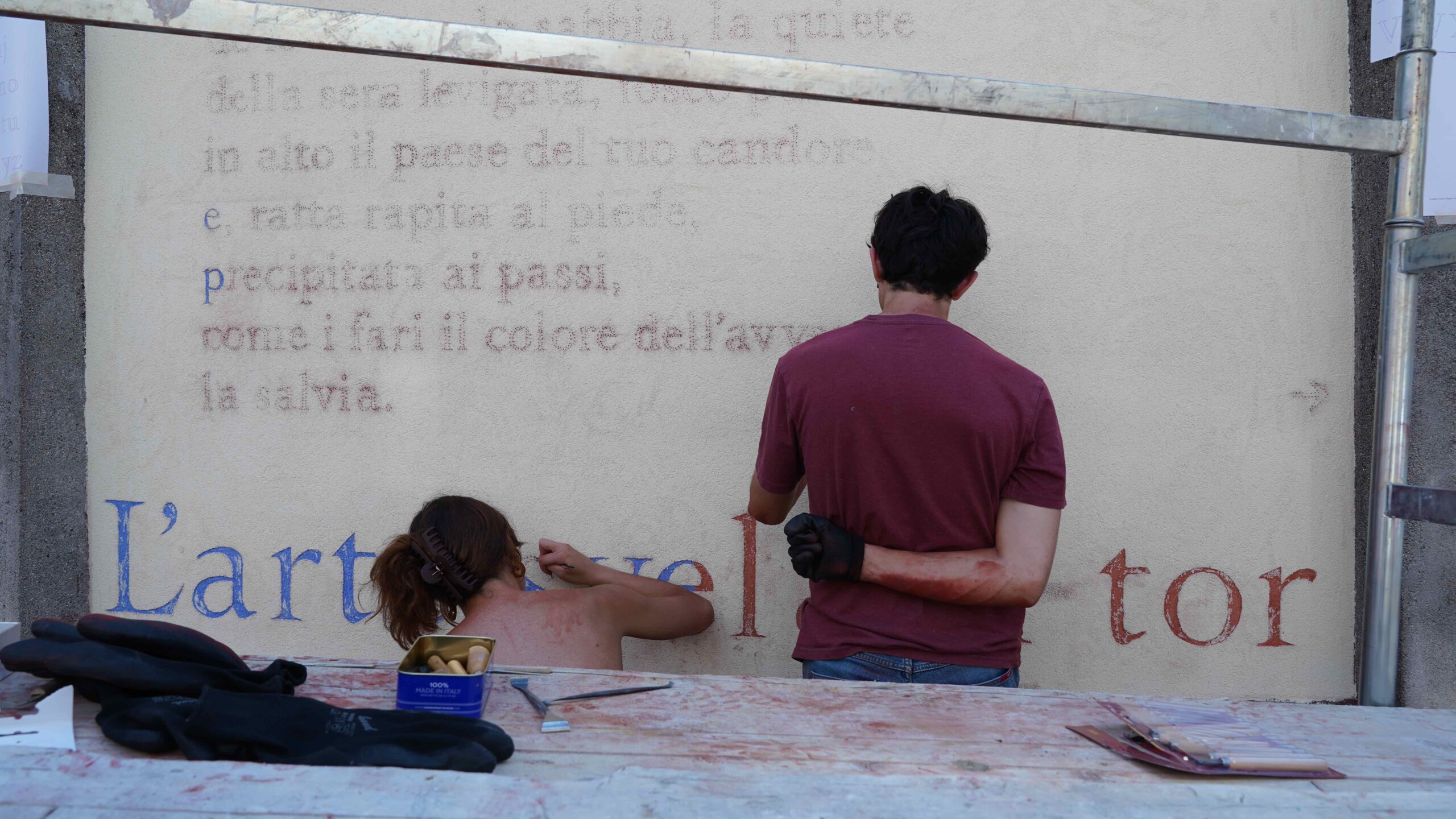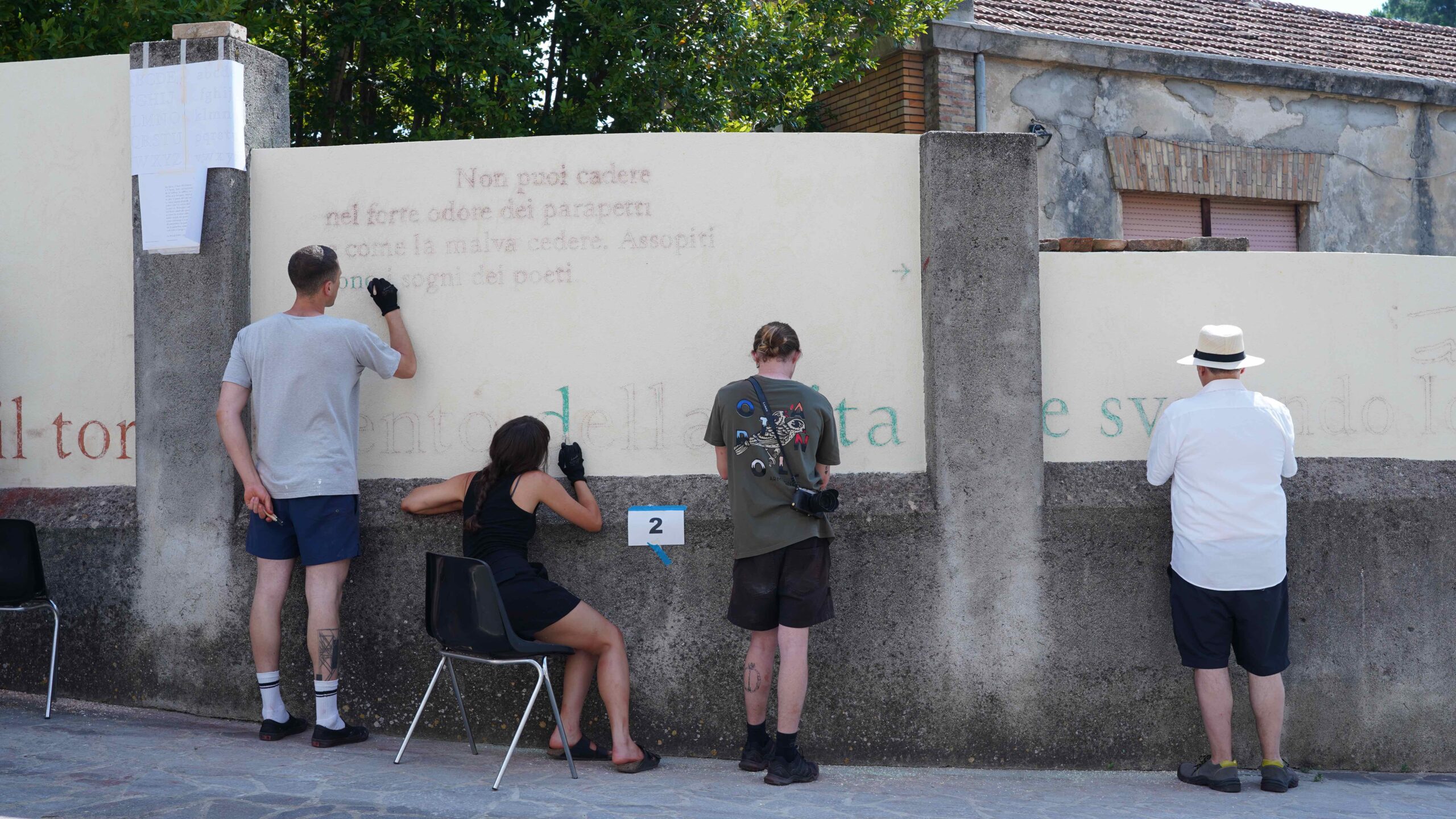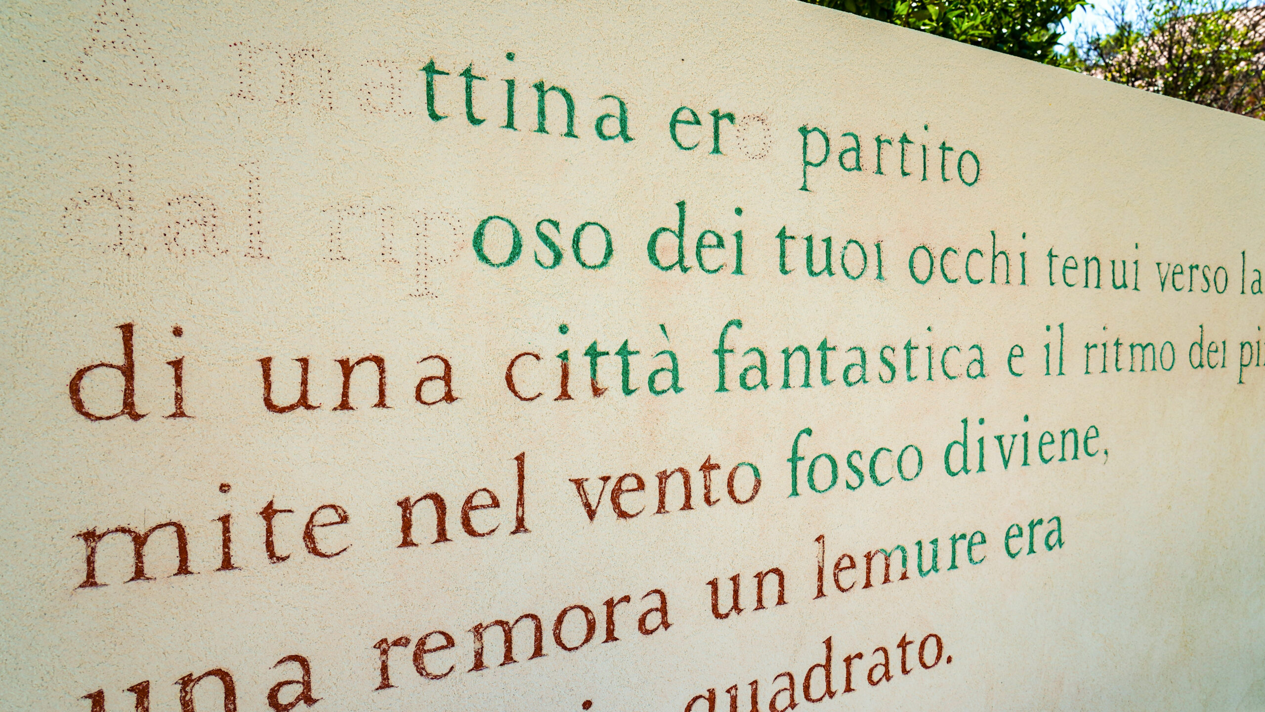 L’opera murale originale è eseguita con la tecnica dello splolvero e sgraffito e raffigura, in questa nuova versione, una preziosa selezione di versi e di disegni tratti dall’antologia di poesie di Lorenzo Calogero Un’orchidea ora splende nella mano (edizioni LYRIKS, 2024).
